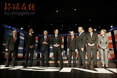 中國日報網環球在線消息:美國民主黨候選人4月26日晚上在南卡羅萊納州立大學舉行競選總統的第一輪辯論,他們在辯論中批評布什發動伊拉克戰爭,敦促他重新考慮對含伊拉克撤軍時間表戰爭撥款法案的否決威脅。紐約州參議員希拉里說:“如果布什不從伊拉克撤軍,當我成為總統時,我會批準從伊撤軍。”