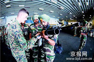 演習(xí)主角仍是印美兩國。它們從1993年開始每年都舉行“馬拉巴爾”聯(lián)合軍事演習(xí)。此次演習(xí)旨在加強參演艦隊之間的相互協(xié)調(diào)能力,將包括進攻與防守任務(wù)、水面戰(zhàn)與潛艇戰(zhàn)、海上封鎖及打擊海盜等海上恐怖主義的行動。左上壓題照片:美海軍陸戰(zhàn)隊員向印度官兵展示榴彈發(fā)射器。