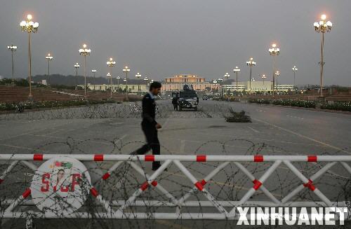 11月17日,巴基斯坦警察在通往總統(tǒng)府的封鎖線處執(zhí)勤。當(dāng)天是巴基斯坦看守內(nèi)閣總理就職后的第二天,警方繼續(xù)封鎖通往總統(tǒng)府的道路。新華社記者周磊攝