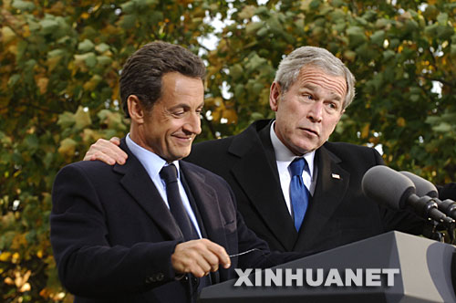 11月7日,美國總統(tǒng)布什(右)與來訪的法國總統(tǒng)薩科齊在弗吉尼亞州的華盛頓故居――芒特弗農(nóng)舉行會談并舉行聯(lián)合記者會。新華社記者張巖攝