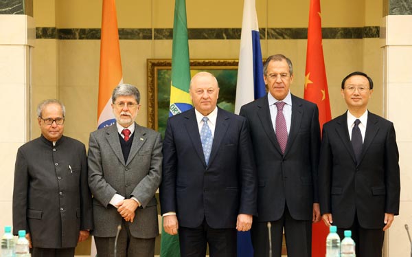 5月16日,在俄羅斯葉卡捷琳堡市,印度外長慕克吉、巴西外長塞爾索·阿莫林、俄羅斯斯維爾德洛夫斯克州州長愛德華·羅塞爾、俄羅斯外長拉夫羅夫、中國外長楊潔篪(從左至右)在會(huì)談前合影。當(dāng)日,中俄印巴四國外長在這里舉行會(huì)談,這是四國外長在聯(lián)合國框架之外的首次會(huì)晤。中國外長楊潔篪在會(huì)談中表示,中國對(duì)解決當(dāng)前世界糧食安全問題做出了巨大貢獻(xiàn),四國作為重要經(jīng)濟(jì)體,應(yīng)共同努力,維護(hù)世界經(jīng)濟(jì)的均衡、協(xié)調(diào)與可持續(xù)發(fā)展。 新華社記者沈伯韓攝