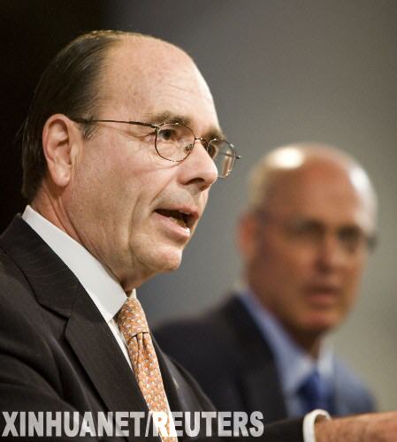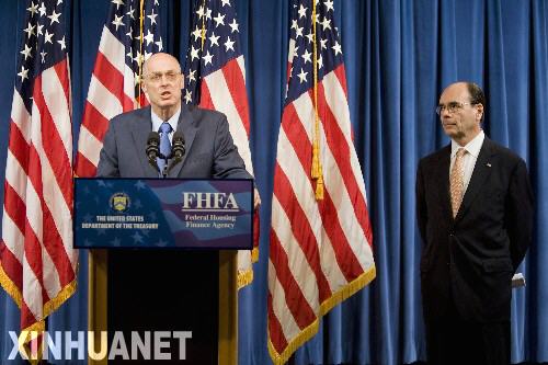 9月7日,美國財政部長保爾森(左)和聯邦住房金融局局長詹姆斯·洛克哈特在新聞發布會上宣布,美國政府接管陷入困境的美國兩大住房抵押貸款融資機構房利美和房地美。新華社發