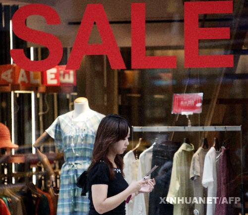 資料圖片:8月13日,在日本首都東京,一名顧客從打著降價廣告的服飾店前走過。日本內(nèi)閣府當日公布的初步統(tǒng)計數(shù)據(jù)顯示,去除物價變動因素,今年第二季度日本國內(nèi)生產(chǎn)總值比第一季度下降了0.6%,按年率計算下降了2.4%。這是日本經(jīng)濟去年第二季度以來再次出現(xiàn)負增長。新華社/法新