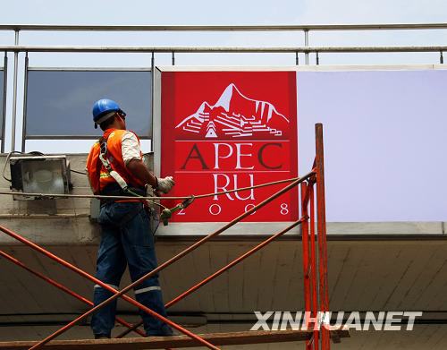 11月14日,在秘魯首都利馬,一名工人在安裝亞太經(jīng)合組織(APEC)第16次領(lǐng)導(dǎo)人非正式會(huì)議的宣傳畫(huà)。亞太經(jīng)合組織(APEC)第16次領(lǐng)導(dǎo)人非正式會(huì)議將于11月22日至23日在秘魯首都利馬舉行。新華社記者王晗攝