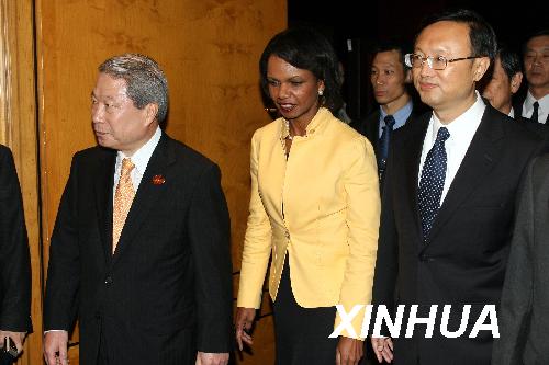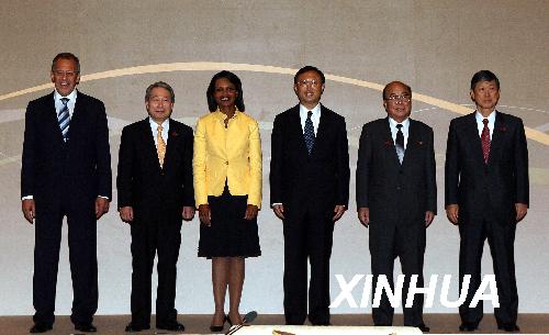 7月23日, 六方會談成員國外長在新加坡舉行非正式會晤。這是(左起)俄羅斯外長拉夫羅夫、韓國外交通商部長官柳明桓、美國國務卿賴斯、中國外長楊潔篪、朝鮮外務相樸義春和日本外相高村正彥在會晤前合影。新華社記者張鳳國攝