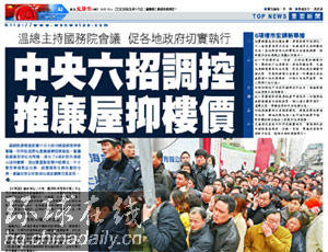 環(huán)球在線消息:國務(wù)院總理溫家寶5月17日主持召開的國務(wù)院常務(wù)會(huì)議認(rèn)為,中央去年實(shí)施加強(qiáng)房地產(chǎn)市場調(diào)控的決策和部署以來,各地區(qū)、各部門做了大量工作,房地產(chǎn)投資增長和房價(jià)上漲過快的勢頭初步得到抑制。但房地產(chǎn)領(lǐng)域的一些問題尚未根本解決,主要是少數(shù)大城市房價(jià)上漲過快,住房供應(yīng)結(jié)構(gòu)不合理矛盾突出,房地產(chǎn)市場秩序比較混亂。