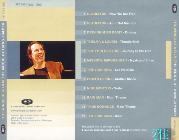點評:我們可以注意到,碟中基本沒有選錄令樂迷最耳熟能詳的動作片配樂(石破天驚、斷箭、紅潮等等),而是選用了多首旋律相比之下更為深沉、雋永的作品。如《末路狂花》中的無奈與哀愁,《細紅線》中的悲天憫人,《為戴西小姐開車》中的輕松小品,《雨人》中的浪跡天涯……無一不體現了Hans