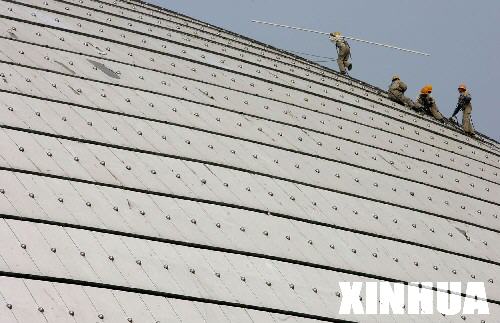 4月3日,幾名工人在國家大劇院屋頂施工。 國家大劇院位于北京人民大會堂西側(cè),總占地面積12公頃。劇院總建筑面積約15萬平方米,總投資26.88億元,主體建筑由歌劇院、音樂廳、戲劇場三部分組成。 新華社記者 李明放 攝