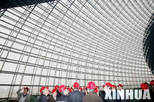 4月3日, 參觀者在國家大劇院內(nèi)觀賞正在施工的主體建筑。新華社記者 李明放 攝