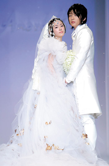 畢竟是以婚紗設計聞名的安德烈-金,兩位主角最后演繹的壓軸婚紗讓人們見識到了大師的功力。李俊基的奶白色絲質禮服與韓志敏的華麗婚紗搭配,顯現了安德烈·金極力展現的夢幻與浪漫