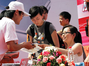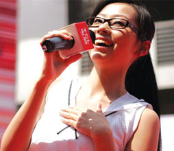 14:30,良好的秩序被靚穎“破壞”,當一身休閑打扮、梳著長長馬尾、戴著小小眼鏡的她出現在現場時,歡呼、尖叫與口號響徹全場,頓時將本來就高的氣溫“提升”了好幾度,惹得主持人也拿天氣開起玩笑:“靚穎到北京,中關村堵了;靚穎到上海,上海火了;靚穎到重慶,重慶就熱了。”