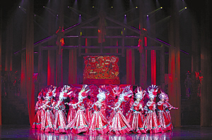 比如苗族集體舞《反排木鼓舞》,其音樂就是在原始的鼓點聲中鋪墊了一些電聲樂器,使舞蹈在音樂的烘托下,既保持了原汁原味的民族風(fēng)格,又更符合國際演出市場的審美取向;又如苗族男女聲對唱《游方場》,加入了具有現(xiàn)代感的布魯斯音樂,使之更加悠揚婉轉(zhuǎn)。在舞蹈編排上,《多彩貴州風(fēng)》也頗多創(chuàng)新,土家擺手舞《擺啊擺》、布依族舞蹈《媽媽歌》等都是在傳統(tǒng)舞蹈中融入現(xiàn)代舞蹈語匯,超越了原生態(tài)的樸實而倍添舞臺表現(xiàn)力。此外,《多彩貴州風(fēng)》最為出彩的一個方面,就是展示了貴州絢麗多姿的服飾文化。貴州的多民族服飾,尤其是苗族服飾,具有強大的吸引力。