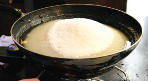 把白砂糖倒入鍋中,按糖與水2:1的比例加入水,用猛火熬20分鐘左右。糖熬到剛剛好時(shí),呈黏稠的透明狀。如果熬制時(shí)間不夠,糖會粘牙;如果熬得過久,糖則會泛苦味。