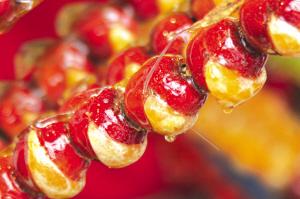 冰糖葫蘆,跳動在冰天雪地的白色世界里的一串火紅,是每個(gè)異鄉(xiāng)客眼里最醒目的北京標(biāo)志,更是每個(gè)土生土長的北京人心中一段根深蒂固的記憶。一陣秋風(fēng)一陣涼,隨著新鮮紅果的上市,賣冰糖葫蘆的小攤便“千樹萬樹梨花開”般出現(xiàn)在各個(gè)胡同里弄的街頭巷尾。無論男女老少,人手一串冰糖葫蘆,歪著頭咬上一口,薄薄的冰糖下面是飽滿的紅果,甜中裹著酸的滋味讓人們臉上泛起和煦的笑容。