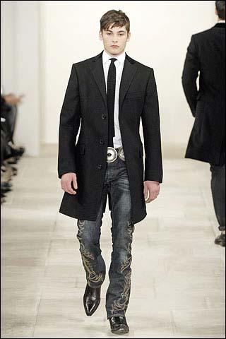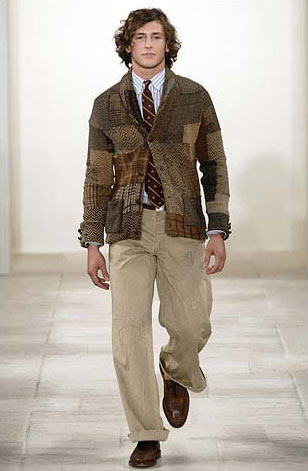 Lauren心中男人的一種原型,如果整個系列有44個Look,那么他就有44份文本,來講述服裝背后的精神與概念,開場是拼貼絨呢的皺縮外套,搭配用料過剩的斜紋長褲,粗皮鞋…呈現出游民或勞工階級的頹廢感;接著,是Ralph