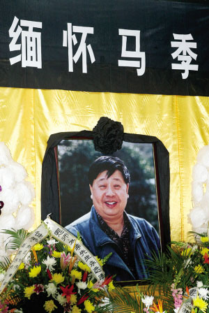 靈堂處于三樓排練廳,在樓梯兩旁擺滿了前一天姜昆從花鄉訂來的盆花。會場內,悼念馬老的花圈、挽聯擺了一屋子,是各省市曲藝團、相聲學會,以及國外曲藝界人士送來的。廳內正中央掛著馬老的遺像,是他上世紀80年代末在威海演出時的留影。馬老的徒弟們在遺像右側站成一排,負責接待。姜昆、趙炎、馮鞏、劉偉、笑林等泣不成聲,看遺像的眼神就像孩子看自己的父親!拔覀儗24小時輪流在這里守靈,讓師傅安穩地走。”馮鞏擦著眼淚說。