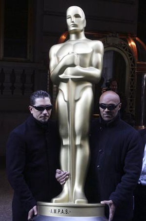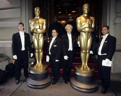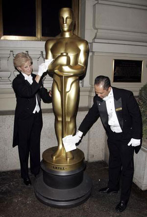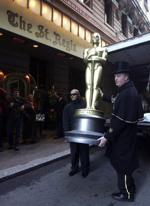 中國日報網環球在線消息:2007年2月22日,昨日,八尺高的奧斯卡金人模型已經送抵The St. Regis 酒店,美國電影藝術和科學學院(Academy of Motion Pictures Arts and Sciences)將在此舉辦紐約奧斯卡夜宴。酒店內的工作人員將它們擦拭的金光可鑒。