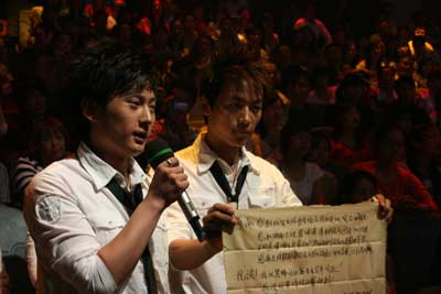 中國日報網(wǎng)環(huán)球在線消息:5月13日晚,隨著西安唱區(qū)冠軍蘇醒的誕生,2007“快樂男聲”結(jié)束了六場分唱區(qū)10進(jìn)1的角逐,并且即將在18、19兩日打響48小時突圍戰(zhàn)。在西安唱區(qū)比賽中,現(xiàn)場發(fā)生了一個小意外,被淘汰的“酷繪樂團(tuán)”到場為兄弟們打氣,樂隊主唱拿出一塊布,上面醒目地寫著“酷繪樂團(tuán)抗議”。