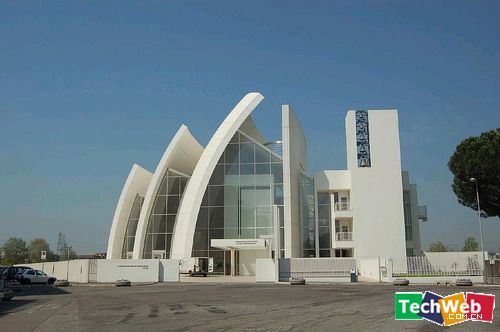 羅馬千禧教堂是由美國建筑師理查邁爾(Richard Meier)設計的,并于2003年完工。它高57~90尺不等,如船帆狀的三片白色弧墻,層次井然地朝垂直與水平雙向彎曲,似球狀的白色弧墻曲面。