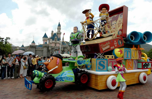 5月1日,迪士尼卡通人物在巡游表演中向游客致意。當(dāng)日,香港迪士尼游客如織,香港迪士尼推出一系列精心設(shè)計(jì)的游樂項(xiàng)目,以吸引更多游客。