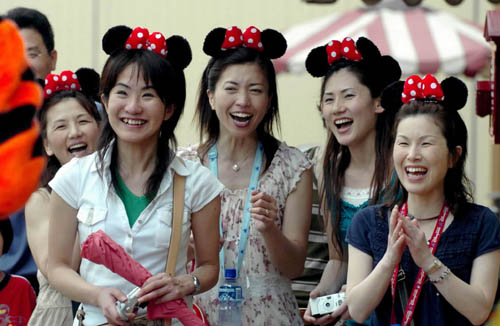 5月1日,幾名頭戴卡通紀念品的游客在迪士尼樂園觀看巡游表演。當日,香港迪士尼游客如織,香港迪士尼推出一系列精心設計的游樂項目,以吸引更多游客。