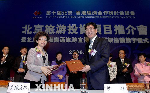 中國日報網環球在線消息:北京市旅游局局長杜江(右)和香港旅游發展局副總干事李陳嘉恩出席奧運旅游宣傳促銷框架協議簽字儀式(11月16日攝)。 香港回歸祖國9年多來,推動香港與內地經濟進一步融合已成為香港社會共識。