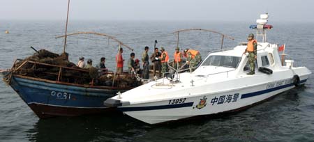 海警支隊(duì)的巡邏艇在進(jìn)行模擬查處非法船只的演練
