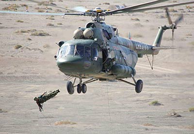 資料圖:7月12日,即將出國參加“和平使命—2007”上海合作組織成員國武裝力量聯(lián)合反恐軍事演習的中方參戰(zhàn)部隊特種作戰(zhàn)隊員在進行快速滑降訓練。