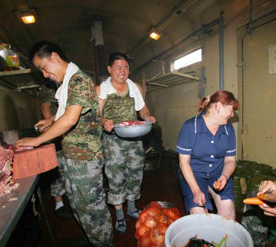 7月30日,在參加“和平使命-2007”軍演的軍列上,炊事班里的笑聲不斷。在俄方提供的軍列上,伙食由中方參演部隊自行保障,俄方只安排了兩名女幫廚協(xié)助戰(zhàn)士們做飯。于是,軍列上出現(xiàn)了由中俄雙方人員共同組成的“聯(lián)合炊事班”。軍列上有俄方軍代表、安全警務人員、乘務員和幫廚共20人,他們都很喜歡吃中國菜。