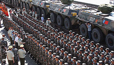 7月20日,中國人民解放軍參加“和平使命-2007”上海合作組織成員國武裝力量聯合反恐軍事演習部隊首批鐵路輸送的300多名官兵,在新疆吐魯番啟程開赴俄羅斯境內演習地域。這次演習,是人民解放軍歷史上首次成建制較大規模、遠距離、多軍兵種出境參加聯合軍演,也是上海合作組織全體成員國參加的首次聯合反恐軍事演習。新華社記者王建民攝