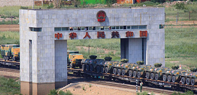 7月27日13時02分,參加“和平使命―2007”聯合反恐軍演的中方第一批鐵路運輸參演部隊換乘俄羅斯軍列,駛出滿洲里口岸進入俄羅斯境內。這是中方重型裝備搭乘俄羅斯軍列通過中國國門。新華社記者 李剛攝