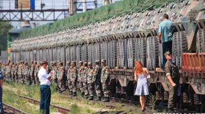 7月28日,“和平使命-2007”軍演中方參演部隊進入俄羅斯后,中俄雙方對裝備進行安全檢查。北京時間28日13時10分,參加“和平使命-2007”上海合作組織聯合反恐軍事演習的中方最后一批鐵路運輸參演部隊換乘俄羅斯軍列,安全駛出滿洲里口岸進入俄羅斯境內。這是中國人民解放軍首次搭乘俄羅斯軍列踏出國門執行軍演任務,也標志著中方參演部隊地面輸送第一階段圓滿結束。 新華社記者李剛攝