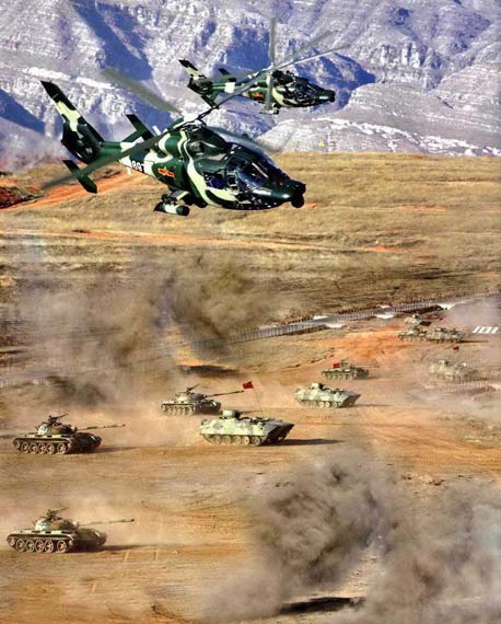 資料圖:中國(guó)陸航部隊(duì)武直九G攻擊直升機(jī)支援陸軍裝甲群