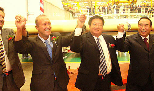 7月24日,空中客車和中國一航的代表在交付儀式上。7月24日,第一架由中國航空企業制造的空中客車A319機翼翼盒由中國一航西安飛機工業(集團)有限責任公司交付給空中客車公司。這架機翼翼盒將運往空中客車在英國布勞頓的工廠進行機翼總裝及系統集成等后續工作。新華社記者 毛海峰 攝