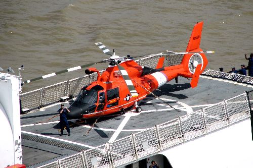 美國國土安全部海岸警衛隊主力執法船“鮑特韋爾”(BOUTWELL)號十六日上午抵達上海高楊路碼頭,開始為期六天的對華友好訪問。圖為該船搭載的海岸警衛隊HH-65型“海豚”直升機。中新社發 穆東祥 攝