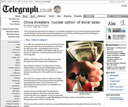 普里查德就這樣“將兩條被單獨報道的引述連接到了一起”,同時加了“一個有力的注釋”。這樣“加工”出來的文章,8月8日出現在《每日電訊報》網站上。編輯為文章配的圖片顯然“獨具匠心”:一只黃皮膚的手緊緊攥著美元,“中國威脅美元”的暗示充斥其間,意味深長。