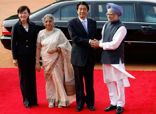 印度總理辛格(右一)22日歡迎到訪的日本首相安倍晉三(右二)及夫人。