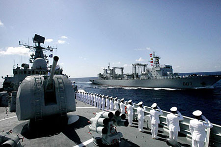 2007年8月1日,中國(guó)海軍出訪編隊(duì)在印度洋上舉行海上閱兵式。新華社記者查春明攝