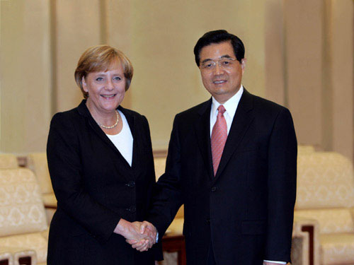 8月27日,國(guó)家主席胡錦濤在北京人民大會(huì)堂會(huì)見(jiàn)德國(guó)總理默克爾。 新華社記者 黃敬文 攝