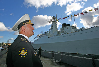 8月27日,在俄羅斯的圣彼得堡市,俄羅斯列寧格勒海軍基地司令員利平斯基海軍少將迎接剛剛抵達的中國海軍艦艇編隊。