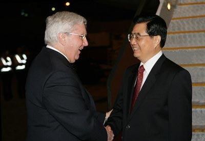 9月3日,國(guó)家主席胡錦濤抵達(dá)澳大利亞西澳州首府珀斯,開(kāi)始對(duì)澳大利亞進(jìn)行國(guó)事訪問(wèn),并將出席在悉尼舉行的亞太經(jīng)合組織第十五次領(lǐng)導(dǎo)人非正式會(huì)議。這是胡錦濤在機(jī)場(chǎng)受到澳大利亞高級(jí)官員的熱情迎接。新華社記者 黃敬文攝