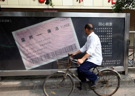 反腐海報走上街頭,市民從一張特殊的火車票前經過,該車票從“腐敗站”始發,終點站為“廉潔”。