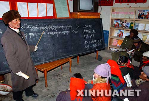 2004年1月14日,西藏班戈縣普保村的老黨員次阿(左)在給群眾進行藏漢雙語的掃盲教育。班戈縣普保村黨支部每周3次對村民進行免費的文化及法制教育。普保村曾是當?shù)赜忻呢毨Т?,近年來,該村黨員積極引導農(nóng)牧民調(diào)整產(chǎn)業(yè)結(jié)構(gòu),大力推廣農(nóng)業(yè)技術(shù),并建立“手把手教、手拉手幫”的扶貧包戶制度,幫助貧困戶脫貧。