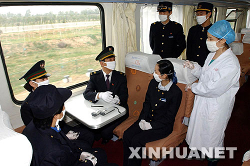 2003年5月29日,北京至濟南T35次列車臨時黨支部成員在研究預防非典在列車上傳播的方案。T35次列車臨時黨支部成員在抗擊非典一線辛勤工作,關鍵時刻把危險留給自己,把安全讓給群眾。