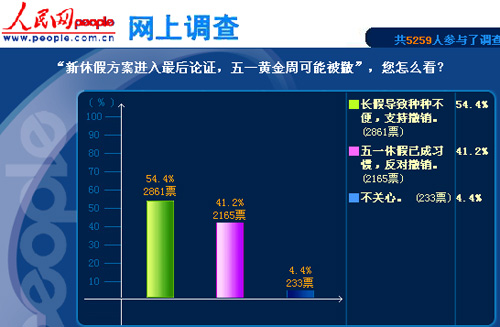 截至10月9日3時,該調查共獲投票5259次,其中明確表示“長假導致種種不便,支持撤銷”選項獲票過半,占總票數54.4%;“五一休假已成習慣,反對撤銷”的觀點獲2165票,占總票數41.2%;而 “不關心”選項獲233票,占總票數的4.4%。