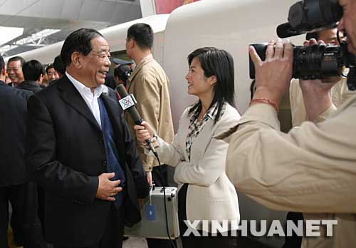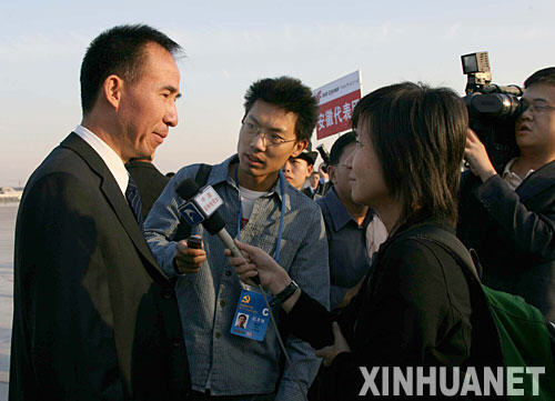 10月12日,出席中國共產黨第十七次全國代表大會的安徽代表團代表抵達北京。這是記者在采訪代表。新華社記者 劉衛兵 攝