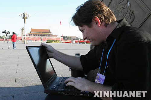 10月15日上午,中國共產黨第十七次全國代表大會將在北京人民大會堂隆重開幕。這是路透社記者戴維在天安門廣場工作。 新華社記者高潔 攝