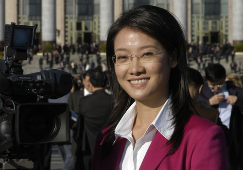 中國共產黨第十七次全國代表大會開幕式于2007年10月15日9:00在人民大會堂舉行。圖為開幕式前在會場外采訪的美麗女記者。