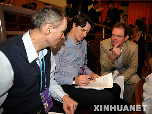 10月15日,中國共產黨第十七次全國代表大會在北京人民大會堂隆重開幕。這是外國記者在大會會場交流。
