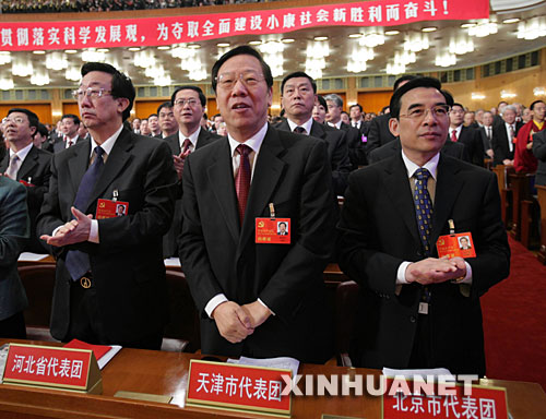10月15日,中國共產黨第十七次全國代表大會在北京人民大會堂隆重開幕。這是北京市代表團、天津市代表團、河北省代表團在大會上。